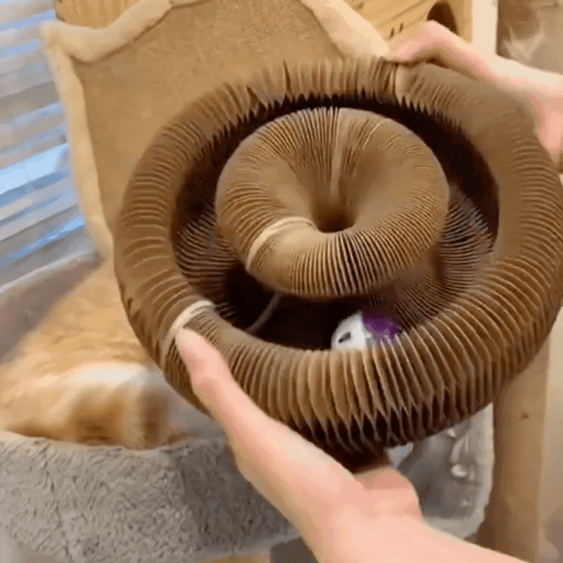 This toy combines a corrugated cat scratch board with an interactive ball track. The round design works as both a scratching surface and a play station. Cats can sharpen their claws on the magic organ cat scratching board while chasing the rolling ball for endless entertainment. The dual function keeps them stimulated physically and mentally.