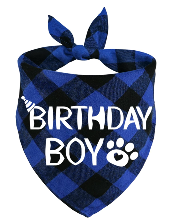 Crafted from soft, durable cotton, it features a classic plaid pattern with a bold “Birthday Boy” print, making it ideal for photos and parties. Its lightweight material ensures pets stay comfortable all day. At the same time, the reversible blank side lets your dog wear it even after the party ends. Whether you need a birthday bandana for dogs or something stylish for everyday use, this one fits perfectly.